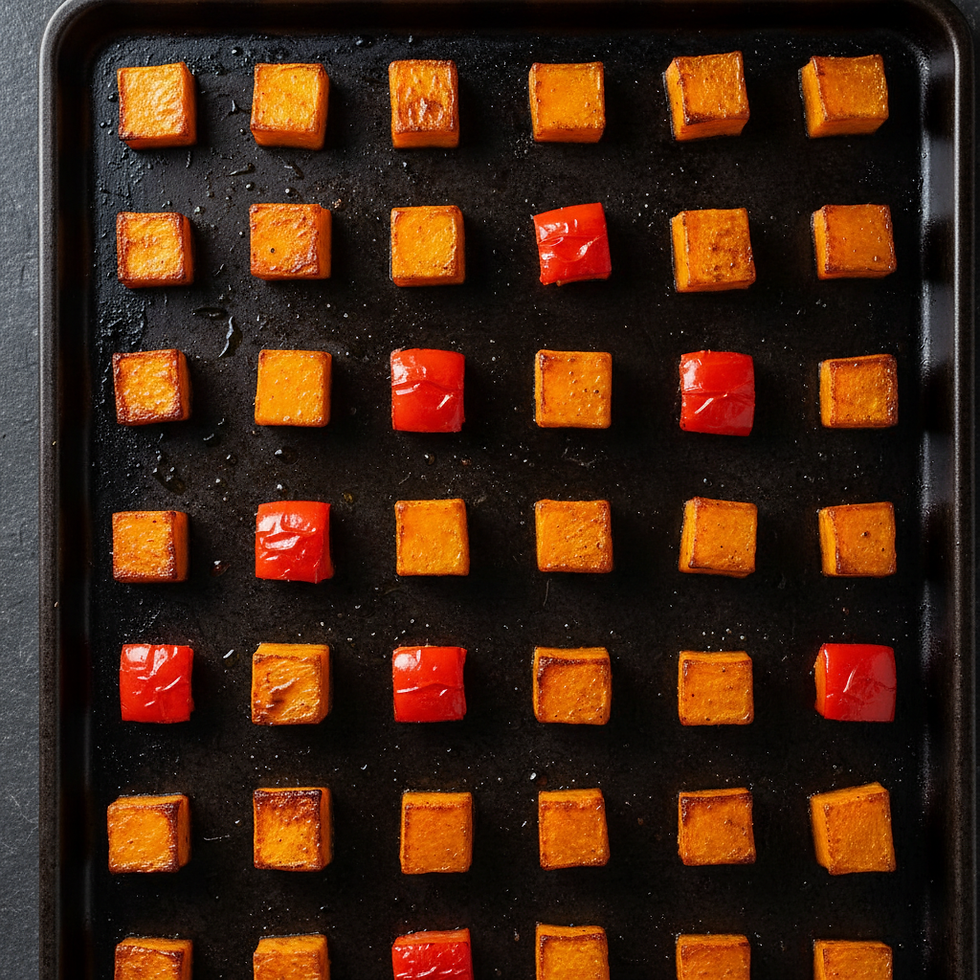 Prompt: A top-down photograph of a dark, professional baking sheet where cubes of butternut squash and red peppers are perfectly spaced apart, exactly two centimeters between each piece. The vegetables are glistening with olive oil and have crispy, caramelized dark brown edges. The background is a clean, dark stone countertop. Photorealistic, high contrast, macro detail.